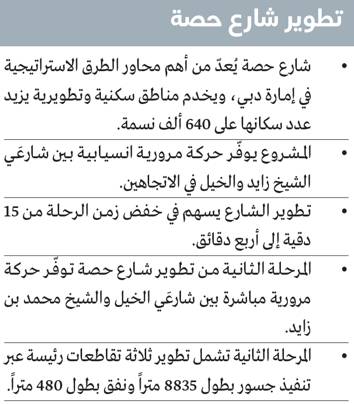وبدأت الهيئة أخيراً في تنفيذ أعمال المرحلة الثانية من مشروع تطوير شارع حصة، من تقاطعه مع شارع الخيل إلى تقاطعه مع شارع الشيخ محمد بن زايد، بطول ثلاثة كيلومترات، ويتضمن تطوير ثلاثة تقاطعات رئيسة، عبر تنفيذ جسور بطول 8835 متراً، ونفق بطول 480 متراً، وتطوير مداخل ومخارج عدد من الشوارع، بما يسهم في زيادة الطاقة الاستيعابية بنسبة 100%، حيث سترتفع من 4000 مركبة في الساعة، إلى 8000 مركبة في الساعة، ويخدم المشروع 10 مناطق سكنية وتطويرية، كما يسهم في خفض زمن الرحلة من 24 دقيقة إلى خمس دقائق، ويقدّر عدد المستفيدين منه، بنحو 650 ألف نسمة، وتسهم المرحلة الثانية من تطوير شارع حصة في توفير حركة مرورية مباشرة بين شارعَي الخيل والشيخ محمد بن زايد.