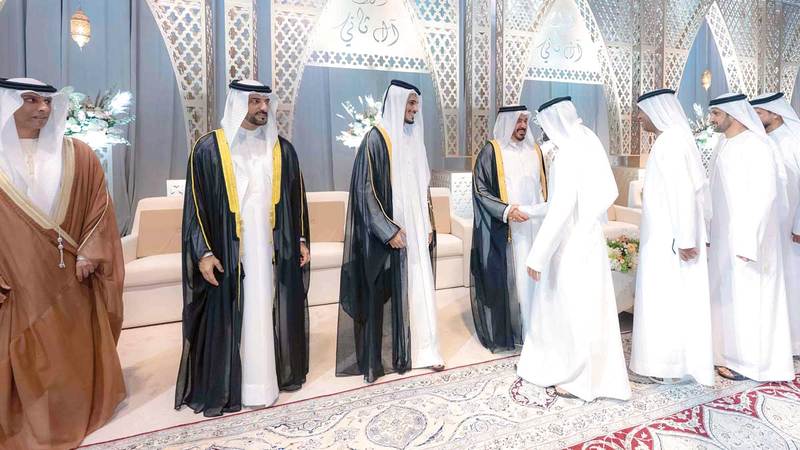 وصافح أصحاب السمو الشيوخ المهنئين الذين قدِموا لتقديم التهاني والتبريكات بالزفاف الميمون، متابعين سموهم عروض الفرق الشعبية التي أحيت حفل الاستقبال، محتفين بالموروث الإماراتي وأصالته، ومعبرين عن مظاهر الفرح والسرور والترابط بين شعب الإمارات وقيادته.