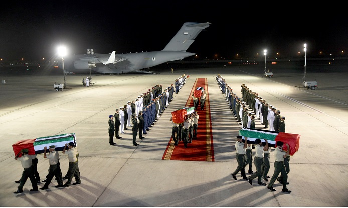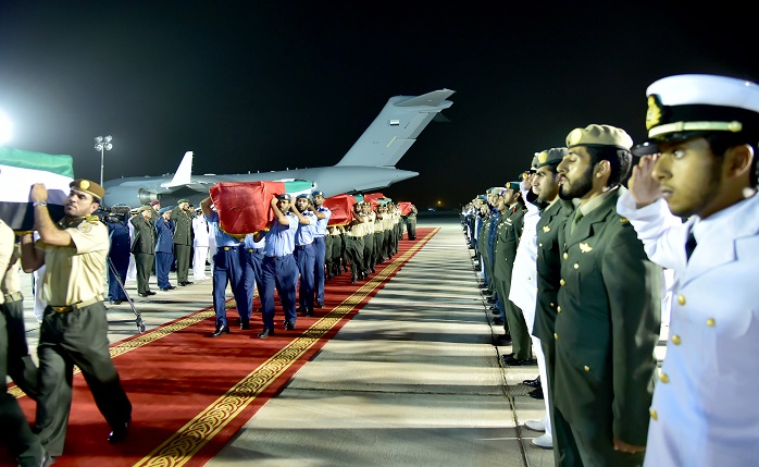بالصور.. وصول جثامين شهداء الامارات إلى أرض الوطن 05 سبتمبر 2015 06 مايو 2016 وصلت الى مطار البطين بأبوظبي فجر اليوم، الجثامين الطاهرة من شهداء الوطن الأبطال على متن طائرة عسكرية تابعة للقوات الجوية والدفاع الجوي يرافقها عدد من ضباط وضباط صف القوات المسلحة. وام وجرت المراسم العسكرية الخاصة لاستقبال جثامين الشهداء على أرض المطار حيث كان عدد من كبار ضباط القوات المسلحة في الاستقبال تويتر لينكدين تويتر فيسبوك Share فيسبوك تويتر لينكدين Pin Interest Whats App