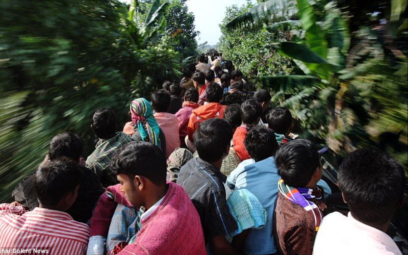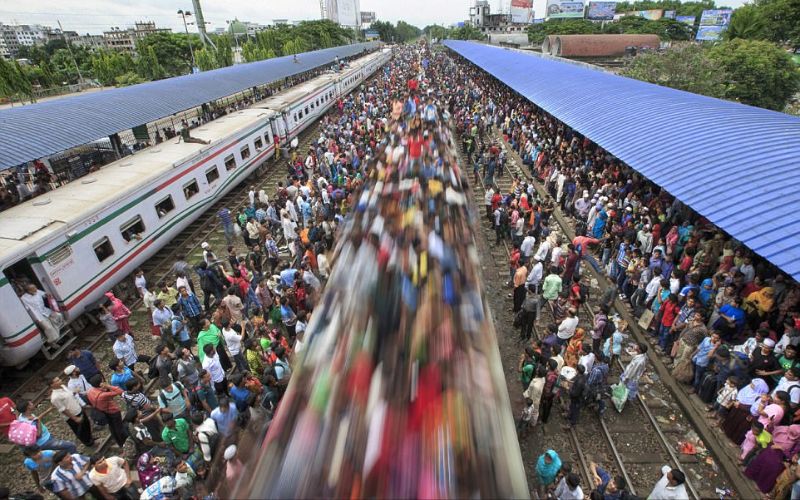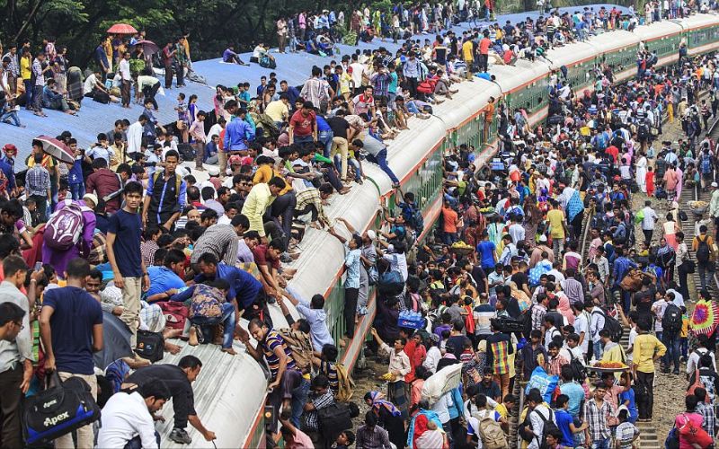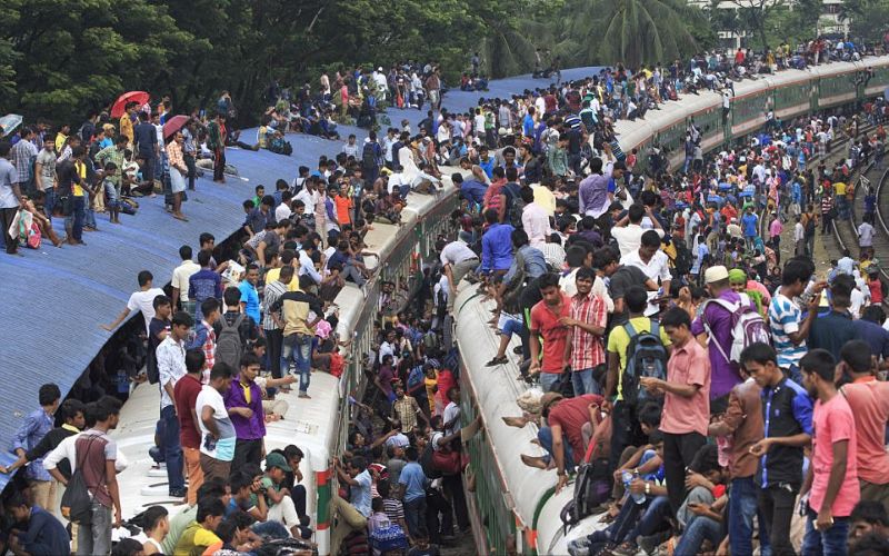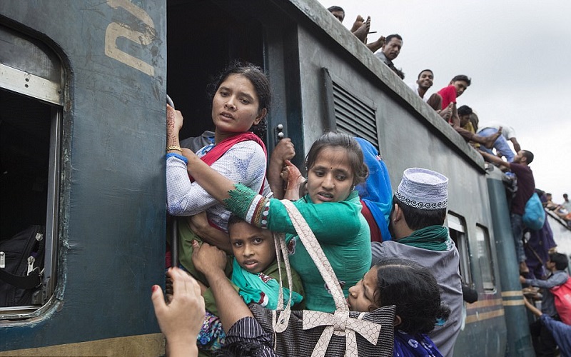 توثق الصور محاولة الآلاف من الأشخاص ركوب القطار في رحلة محفوفة بالمخاطر يوميا في بنغلاديش للوصول إلى منازلهم، ويصل عدد الأشخاص الذين يتسلقون سطح القطار إلى 2000 شخص في ساعات الذروة صباحا ومساء.الديلي ميل. المصور يوسف توشار