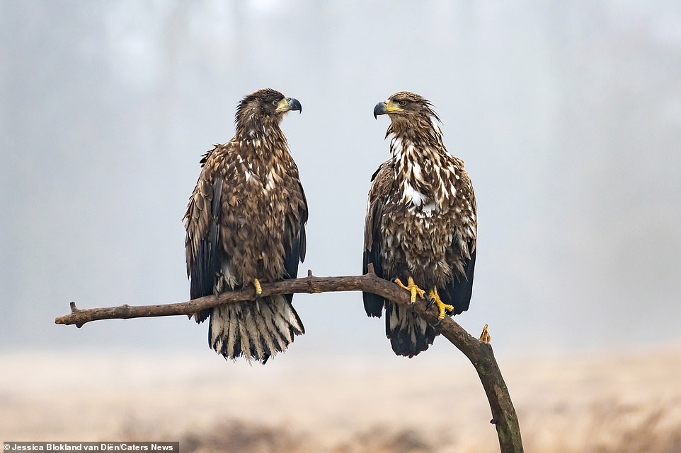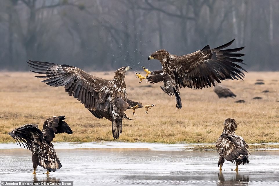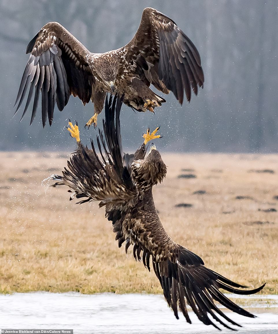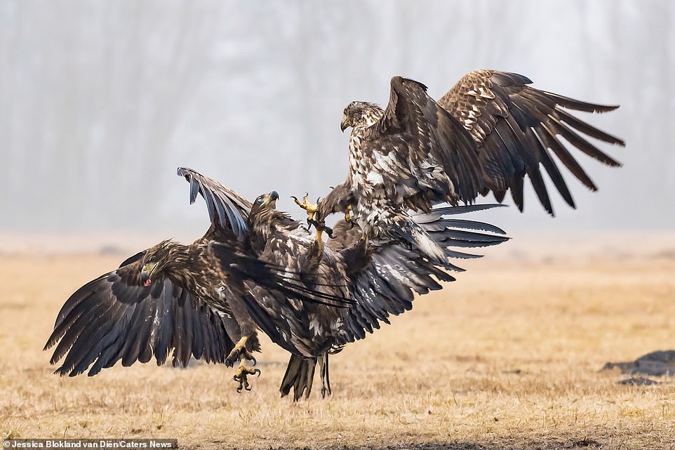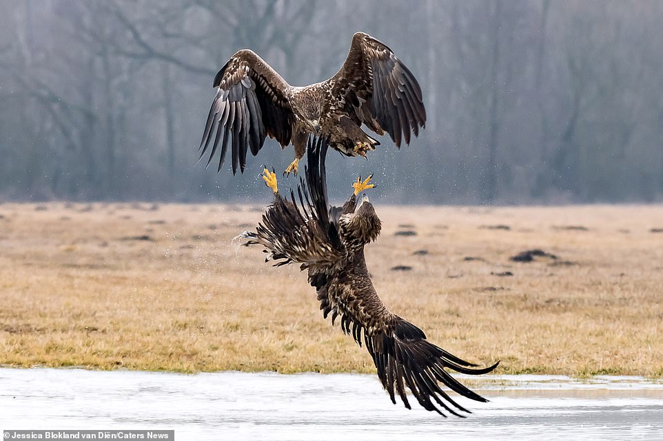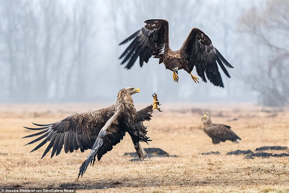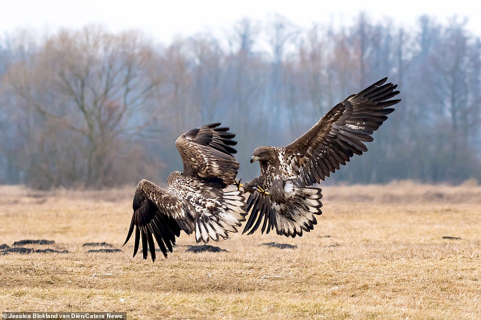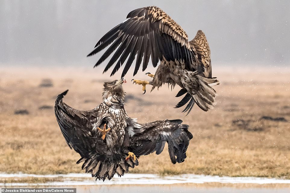نشرت صحيفة "ديلي ميل" البريطانية مجموعة من الصور النادرة لمعركة جوية بين زوجين من النسور  في سماء بولندا.