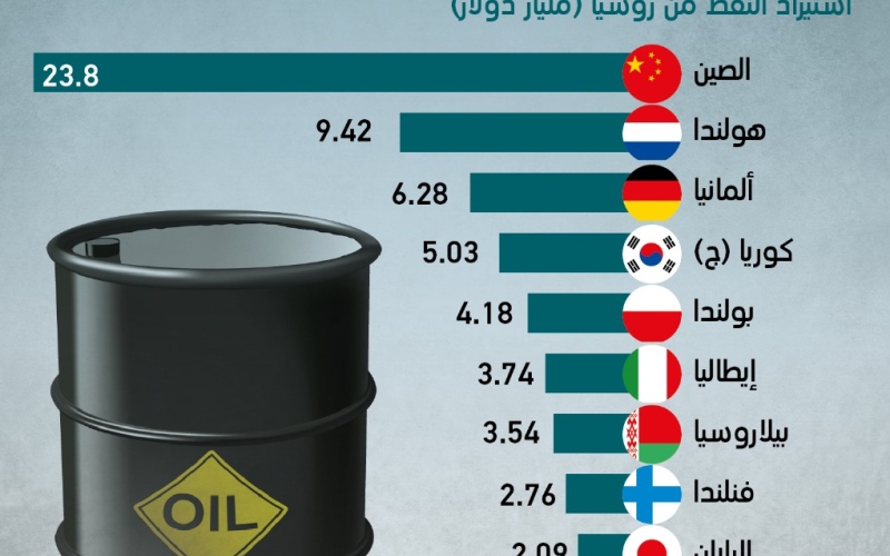 غرافيك.. الكرملين يواجه تراجعاً في عائدات النفط في ظل الحظر شبه الكامل الذي أقره الاتحاد الأوروبي على واردات النفط الخام الروسية، فقدت موسكو سوقاً على عتبة بابها لأكثر
