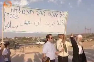 ونظم ليبراليون يهود وفلسطينيون يؤيدون التعايش بين اليهود والفلسطينيين، مظاهرة قرب تقاطع على طريق سريع في الضفة الغربية، رافعين لافتات تدعو للعيش فى سلام.