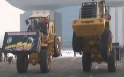 على ايقاع موسيقى الروك آند رول ابتكر سائقا جرافات صينيان رقصات خاصة بمركباتهما الثقيلة ليقدما عرضا استثنائيا في الشارع بمدينة تشانغتشون في شمال شرق الصين.