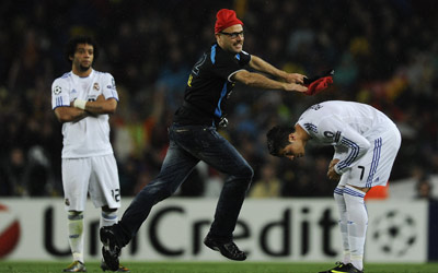 اقتحم مشجع كتالوني أرض ملعب "كامب نو" في برشلونة قبل ثوان قليلة من بداية الشوط الثاني للمباراة التي جمعت،أمس الأول، النادي الكتالوني بضيفه ريال مدريد، في إياب الدور نصف النهائي لدوري أبطال أوروبا، والتي انتهت بتعادل الفريقين 1-1، وبلوغ برشلونة المباراة النهائية للمسابقة.