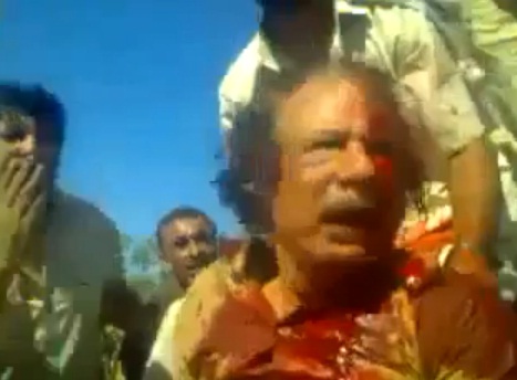نشر ليبيون لقطات فيديو لعملية اعتقال معمر القذافي حياً قبل مقتله.