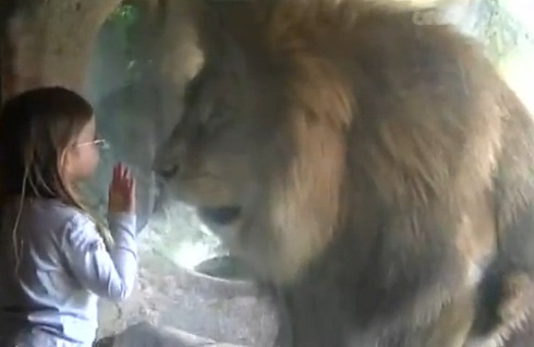 أثبتت طفلة في الثالثة من العمر أن لديها أعصاباً من حديد بعد أن اقتربت من أسد أفريقي كبير، ووضعت عينها بعينه، ولم يكن يفصل بينهما غير الزجاج.