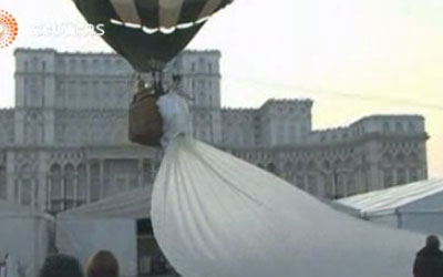 ولإبراز هذا الطول القياسي الفائق، عمدت عارضة الفستان، إلى ركوب منطاد ارتفع إلى السماء، وسط اعجاب الجميع.