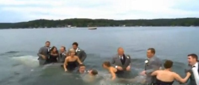 تعرض عروسان وأصدقاء لهما لموقف محرج بعد أن تهدم رصيف خشبي وقفوا عليه لالتقاط صورة تذكارية حيث سقط الجميع في الماء.