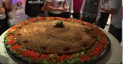 تمكن العاملون بأحد الفنادق الفاخرة في الأردن من صنع أكبر قرص للفلافل في العالم في مسابقة أقيمت الأسبوع الجاري حيث بلغ وزنه أربعة وسبعين فاصل خمسة وسبعين كيلوغراماً.