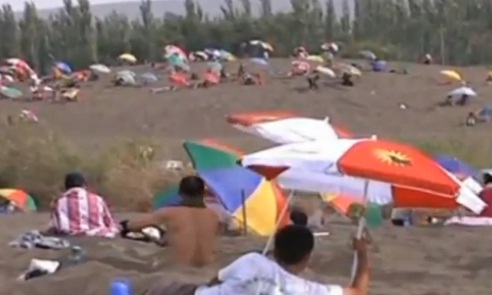 دفع ارتفاع درجات الحرارة في الصين المصابين بأمراض الروماتيزم والتهابات المفاصل للتداوي بالرمال الساخنة من خلال دفن أنفسهم فيها لدقائق، مما يساعد على التخلص من الآلام والالتهابات.