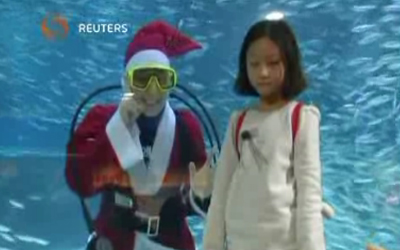 يستقبل متحف للأحياء البحرية في كوريا الجنوبية، عيد الميلاد "كريسماس" هذا العام بعرض خاص تشارك فيه مجموعة ضخمة من أسماك السردين إلى جانب غواص يرتدي ملابس سانتا كلوز.