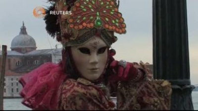 تجمع زائرون لمدينة فينيسيا في ميدان سانت مارك، لمشاهدة أحد أبرز المهرجانات في ايطاليا، وهو مهرجان "رحلة ملاك" الذي ترتدي فيه احدى السيدات ملابس احتفالية أسفل برج الأجراس في ساحة كنيسة سانت مارك.