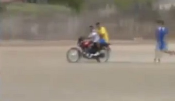 انتشر شريط فيديو على موقع "يوتيوب" يظهر فيه حارس مرمى في مباراة بكرة القدم لم يتم تحديد مكانها يلجأ إلى صديق له يقود دراجة نارية للعودة إلى مرماه بعد مشاركته في هجمة على مرمى الفريق الخصم.