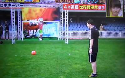 خاض النجم الأرجنتيني، ليونيل ميسي، تحديا خاصا مع حارس مرمى آلي صنعه اليابانيون لإيقاف أهدافه، حيث استطاع ميسي أن يتغلب على الحارس ويسجل في مرماه.