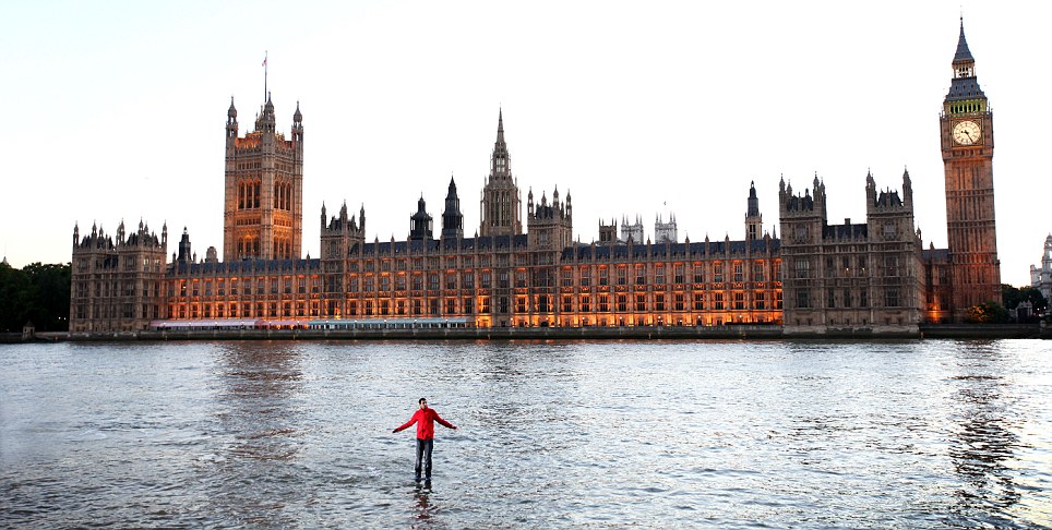 الساحر الذى ولد بمدينة برادفورد البريطانية والذى بلغ عامه 28 استطاع أن يعبر نصف طريق النهر الذى يقع أمام البرلمان البريطانى قبل أن يتم القبض عليه من الشرطة النهرية.