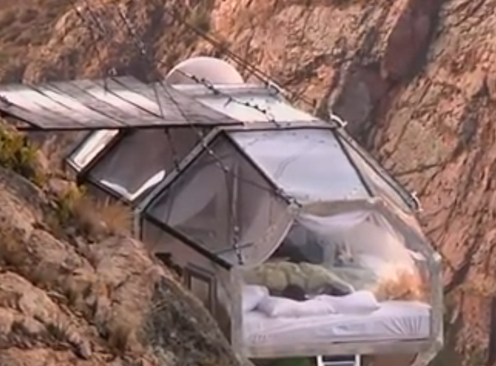 وينام النزلاء في هذا الفندق المصنوع من عوارض قوية من الفولاذ والألمنيوم على ارتفاع 400 متر في غرفة مطلة على الوادي.