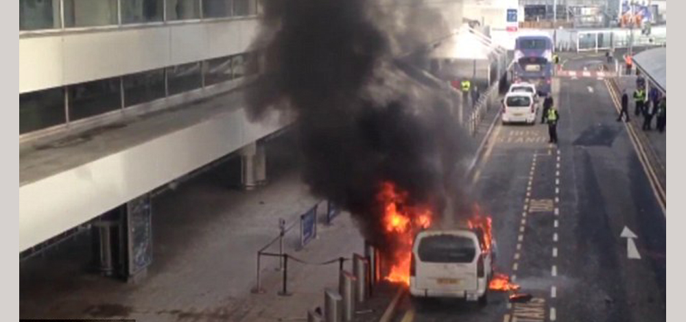 اشتعلت سيارة تاكسي مركونة أمام مطار "غلاسكو" بالنيران بسبب عطل كهربائي فيها.