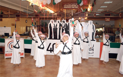 استقبلت الإدارة العامة للإقامة وشؤون الأجانب في أم القيوين طالبات مدرستي السلمة الثانوية والنخبة الأميركية الخاصة ضمن فعاليات اليوم الوطني التي تقام تحت شعار «روح الاتحاد»، حيث قامت طالبات مدرسة السلمة بإلقاء النشيد الوطني وأوبريت «روح الاتحاد»، كما قدم أطفال مدرسة النخبة عرضاً لرقصة «اليوله»، ورسموا لوحاتهم الإبداعية.