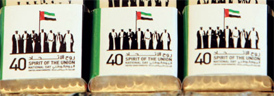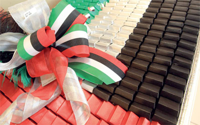 من جهتها، قالت مديرة بوتيك «شوكوا»، ديالا الناظر، إن «هذا العام يتم الاحتفال بالذكرى الـ40 ليوم الاتحاد، وبالتالي ان ما يميز الشوكولاتة هي وجود هذا الرقم عليها، إلى جانب ألوان العلم الإماراتي». ولفتت إلى أن الزينة التي تستخدم على الشوكولاتة تكون من خلال الشرائط التي تزيّن العلب، ويمكن استخدام العلم الإماراتي على قطع الشوكولاتة، أو الزهور الملوّنة بألوان العلم، وكذلك طبع العلم على القوالب.