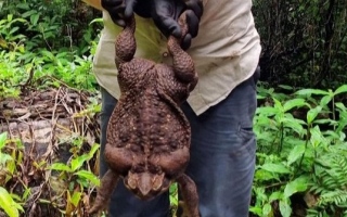 العثور على ضفدع عملاق بأحد المتنزهات الأسترالية.. صور عثر حراس أحراج أستراليون على ضفدع قصب عملاق بين أشجار أحد المتنزهات الساحلية، يصل وزنه إلى 2,7 كيلوغرام فيما طوله مماثل