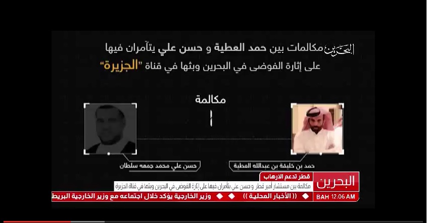 عرض تلفزيون البحرين الليلة تسجيلا لعدة محادثات هاتفية جرت في شهر مارس 2011م بين مستشار أمير قطر حمد بن خليفة العطية والارهابي الهارب حسن سلطان، وبينت هذه المحادثات تآمرهما على اثارة الفوضى في البحرين وبثها في قناة الجزيرة، حسبما ذكرت، اليوم، وكالة الأنباء البحرينية.