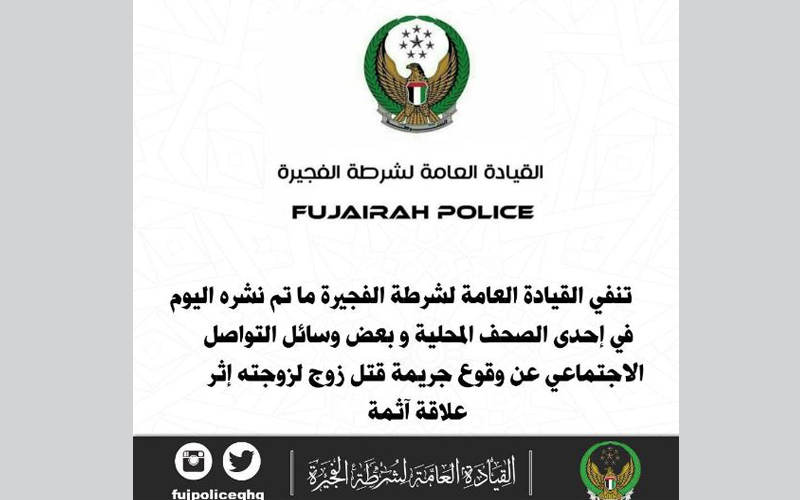 نفت القيادة العامة لشرطة الفجيرة عبر حسابها على "انستغرام" ما تم نشره اليوم في إحدى الصحف المحلية و بعض وسائل التواصل الاجتماعي عن وقوع جريمة قتل زوج لزوجته إثر علاقة آثمة.