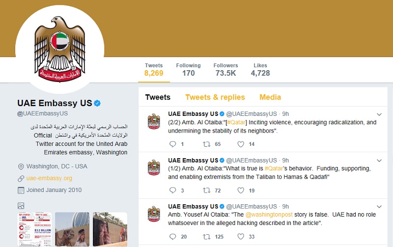 نفى سفير الدولة لدى واشنطن يوسف العتيبة، اليوم، في تغريدات نشرها الحساب الرسمي لبعثة الدولة لدى الولايات المتحدة الأميركية على موقع التواصل الاجتماعي (تويتر) المزاعم التي وردت في تقرير صحيفة "واشنطن بوست" الأميركية من أن دولة الإمارات نظمت اختراق مواقع وسائل الإعلام الرسمية القطرية، حسبما ذكر .