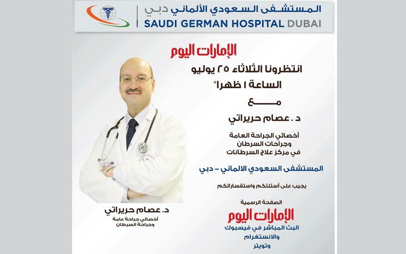 يقدم موقع الإمارات اليوم بثاً مباشراً عبر "فيس بوك" و"انستغرام" و"تويتر"، من المستشفى السعودي الألماني في دبي، مع اختصاصي الجراحة العامة وجراحات السرطان في مركز علاجات السرطانات الدكتور عصام حريراتي.