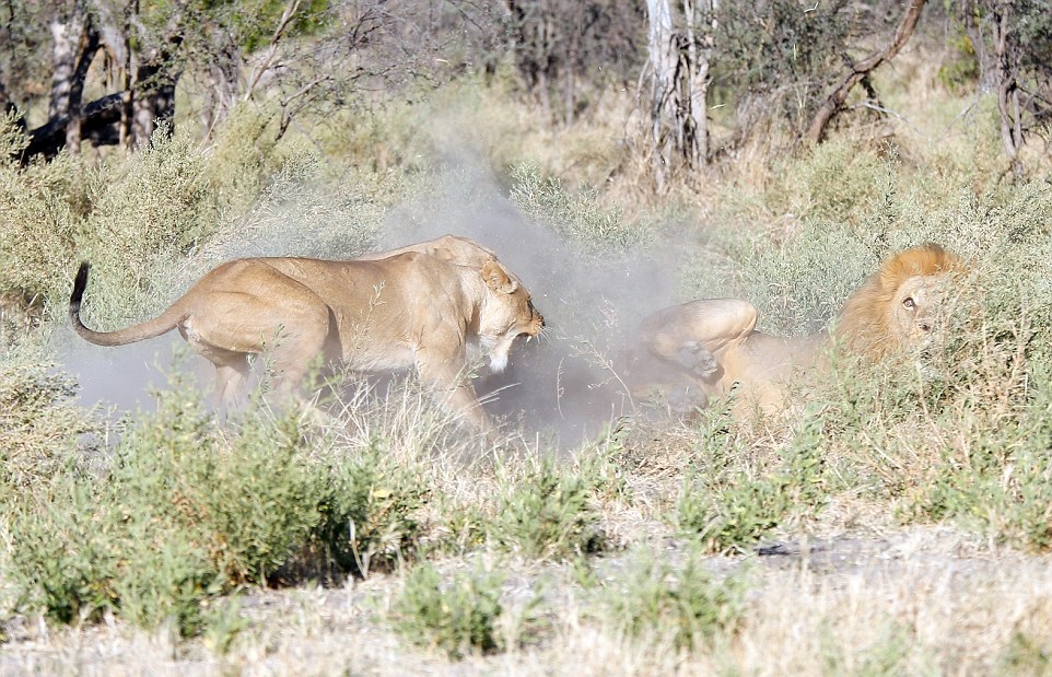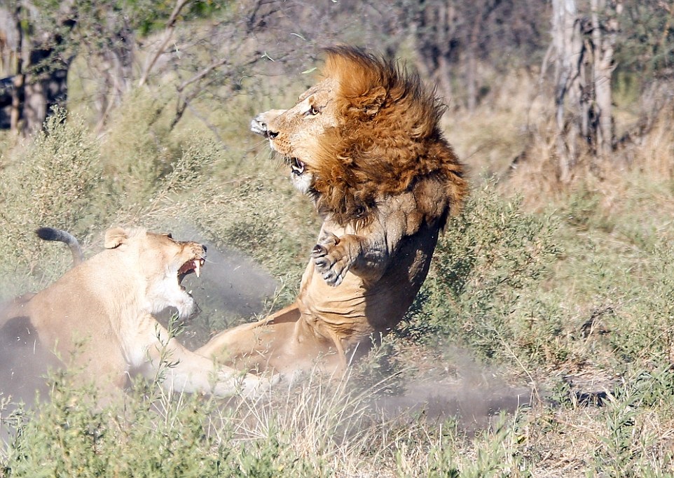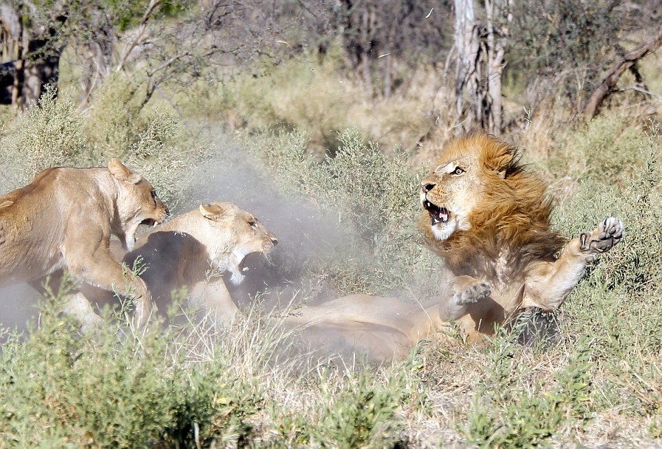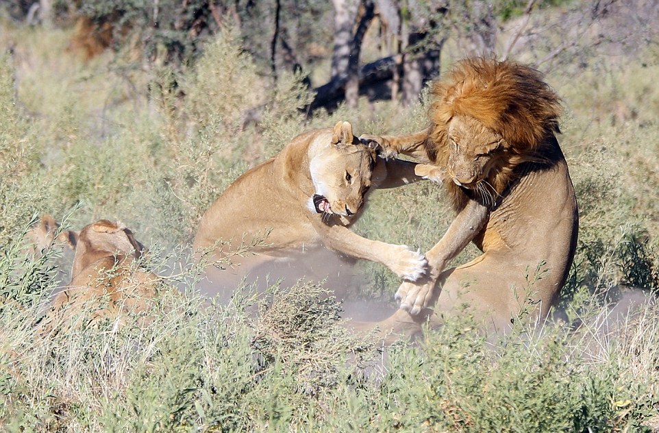 رصدت عدسة الكاميرا صراعا ضاريا بين لبوتين وأسد غاب عن مملكته زمنا طويلا، وتظهر اللقطات التي نشرها موقع "ديلي ميل" محاولة اللبوات إبعاده بشراسة عن الأشبال في ما وصف بأنه عقاب له على غيبته الطويلة.