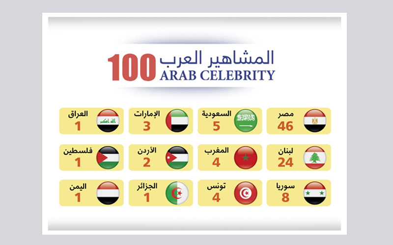 تصدرت مصر أكثر الدول المشاركة في القائمة من خلال 46 شخصية شهيرة، حيث تعد المركز الإقليمي للسينما والبلد الأكبر من حيث عدد السكان، تلتها لبنان بـ 24، ثم سورية بـ 8، والسعودية بـ 5، جاءت المغرب وتونس بـ 4 لكل منهما، تليها الإمارات بـ 3، والأردن 2، فيما شاركت الجزائر والعراق وفلسطين واليمن بمشاركة واحدة فقط لكل منهم.