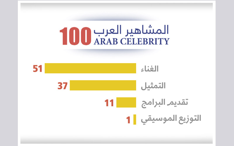 ويعمل معظم المشاهير في القائمة في مجال الموسيقى، وعددهم الإجمالي 51 فنانا، يليهم 37 ممثلاً يتصدرهم "الزعيم" عادل إمام الذي احتل المرتبة السادسة من القائمة بـ 16.44 مليون متابع، بالإضافة إلى 11 مذيعاً، فيما حّل موزع موسيقي وحيد في القائمة هو حسن الشافعي، الذي تصدر غلاف النسخة العربية.