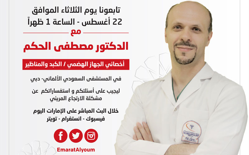 تابعونا، اليوم في تمام الساعة الواحدة ظهرا، ببث مباشر مع الدكتور مصطفى الحكم، أخصائي الجهاز الهضمي / الكبد والمناظير، في المستشفى السعودي الألماني - دبي للحديث والإجابة على اسئلتكم واستفساراتكم عن مشكلة الارتجاع المريئي.