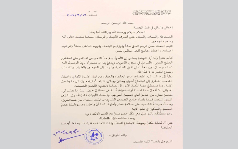 دعا الشيخ عبدالله بن علي آل ثاني إلى اجتماع عائلي ووطني لبحث أزمة قطر وإعادة الأمور لنصابها، وقال إن "واجبنا عدم الصمت في هذه الأزمة".