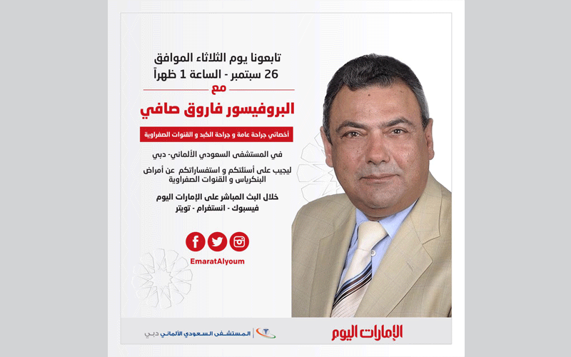 يقدم موقع الإمارات اليوم بثا مباشرا مع اختصاصي الجراحة العامة و جراحة الكبد و القنوات الصفراوية البروفيسور فاروق صافي من المستشفى السعودي الألماني- دبي ، ليجيب على أسئلتكم و استفساراتكم  عن أمراض البنكرياس و القنوات الصفراوية.
