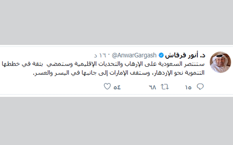أكد وزير الدولة للشؤون الخارجية، الدكتور أنور قرقاش أن السعودية ستنتصر على الإرهاب والتحديات الإقليمية وستمضي بثقة في خططها التنموية نحو الإزدهار، وستقف الإمارات إلى جانبها في اليسر والعسر، وذلك في تغريدة نشرها عبر حسابه في موقع التواصل الاجتماعي "تويتر".