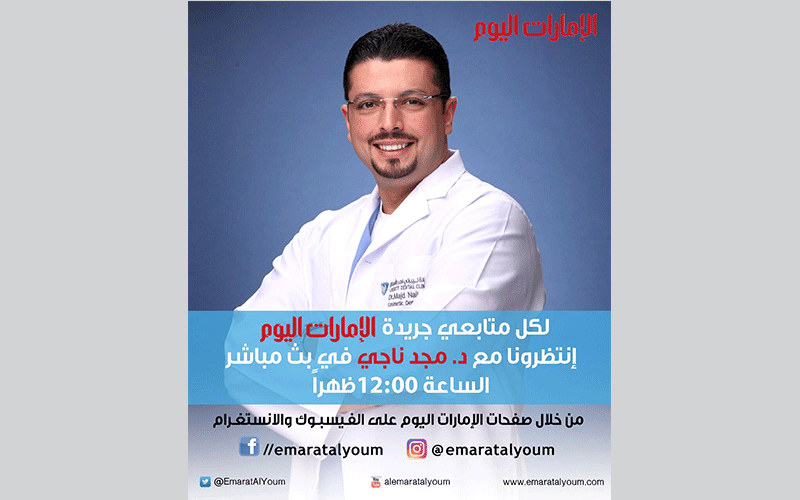 ويمكن للمتابعين توجيه أسئلتهم واستفساراتهم الخاصة بعلاج الأسنان ليقوم عضو الأكاديمية الأميركية لتجميل الأسنان الدكتور مجد ناجي بالإجابة عليها مباشرة بالصوت والصورة.. في لقاء مباشر مع متابعي حسابات "الإمارات اليوم".