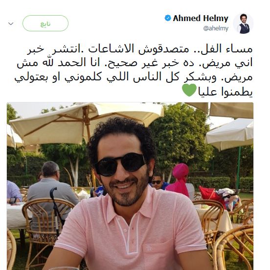 وقال حلمي على صفحته للجمهور:"مساء الفل، لا تصدقوا هذه الإشاعات، حيث انتشر خبر إني مريض وهذا غير صحيح، والحمدلله أنا لست مريضا، وأوجه الشكر لكل من سأل عني"
