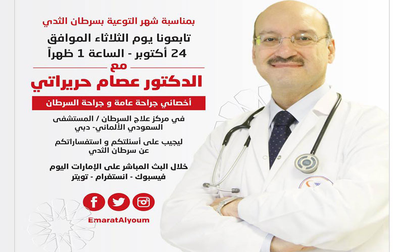 تابعونا الآن، بلقاء مباشر مع الدكتور عصام حريراتي، أخصائي جراحة عامة و جراحة السرطان في مركز علاج السرطان / المستشفى السعودي الألماني- دبي.ليجيب على أسئلتكم و استفساراتكم عن سرطان الثدي. وذلك بمناسبة شهر التوعية بسرطان الثدي.