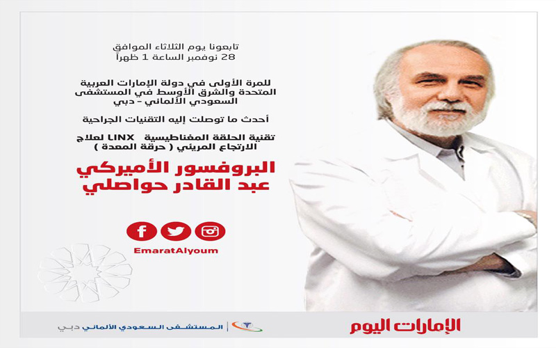 تابعونا الآن، في تمام الساعة الواحدة ظهرا، بلقاء مباشر، من المستشفى السعودي الألماني - دبي، مع البروفيسور الأميركي عبد القادر حواصلي، للحديث عن تقنية الحلقة المغناطيسية لعلاج الإرتجاع المريئي (حرقة المعدة)، والإجابة على اسئلتكم واستفساراتكم.