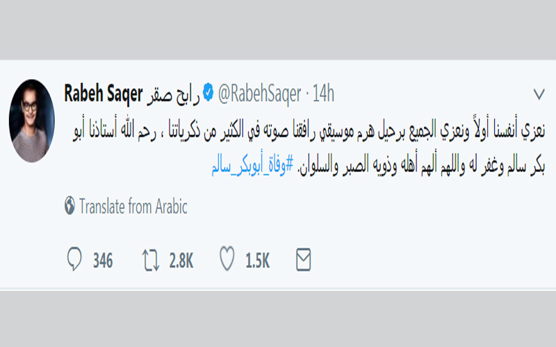 فيما غرد فهد الغامدي "أجودُ بدمعي والدموعُ على الخدِ شهودٌ على الأشواقِ والحُزن والوجدِ رحلتَ جسداً، وبقيتَ صوتاً لا يموت #وفاه_ابوبكر_سالم "