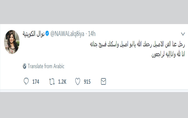 وبدورها غردت الفنانة نوال الكويتية "رحل عنا الفن الاصيل رحمك الله ياابو اصيل واسكنك فسيح جناته