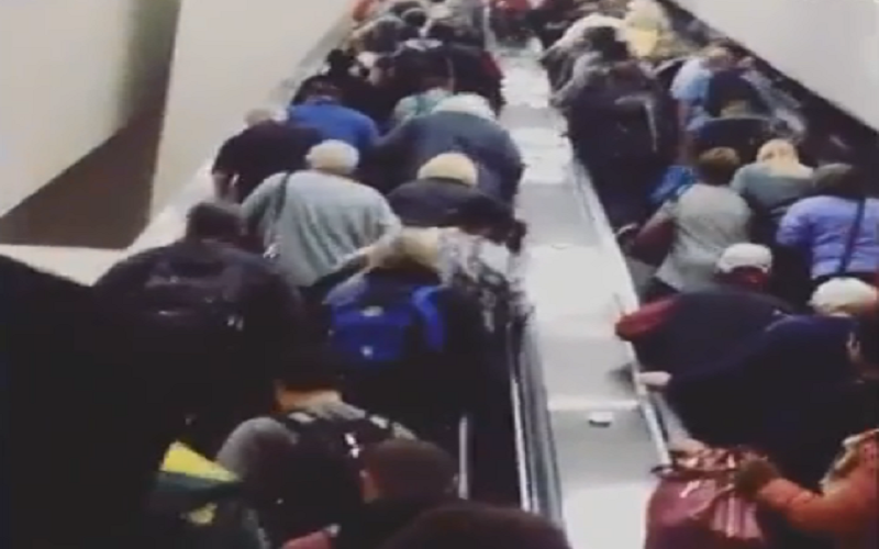 بالفيديو.. موظف مطار يتزحلق على سلم متحرك مزدحم
