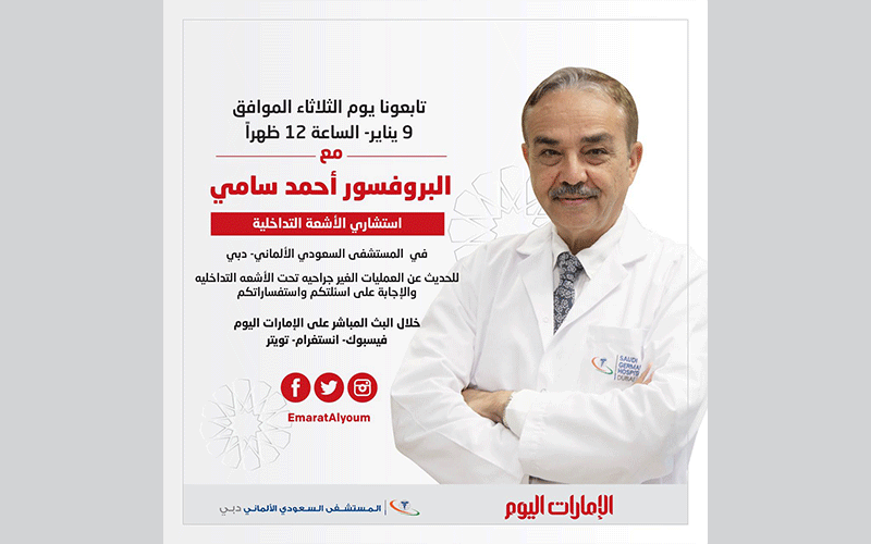 تابعونا الان، بلقاء مباشر، من المستشفى السعودي الألماني - دبي، مع الدكتور أحمد سامي، استشاري الاشعة التداخلية للحديث عن العمليات غير الجراحية تحت الاشعة التداخلية، ليجيب على أسئلتكم واستفساراتكم عن سرطان البروستاتا.