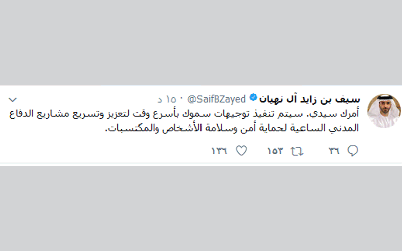 قال سمو الشيخ سيف بن زايد آل نهيان، نائب رئيس مجلس الوزراء وزير الداخلية، في رده على تغريدة صاحب السمو الشيخ محمد بن راشد آل مكتوم نائب رئيس الدولة رئيس مجلس الوزراء حاكم دبي، التي وجه فيها الدفاع المدني بالدولة التأكد بشكل عاجل من وجود أنظمة للحماية من الحرائق متصلة مع الدفاع المدني مباشرة في كافة بيوت المواطنين، على أن تتحمل الحكومة تكلفتها لمن لا يستطيع.