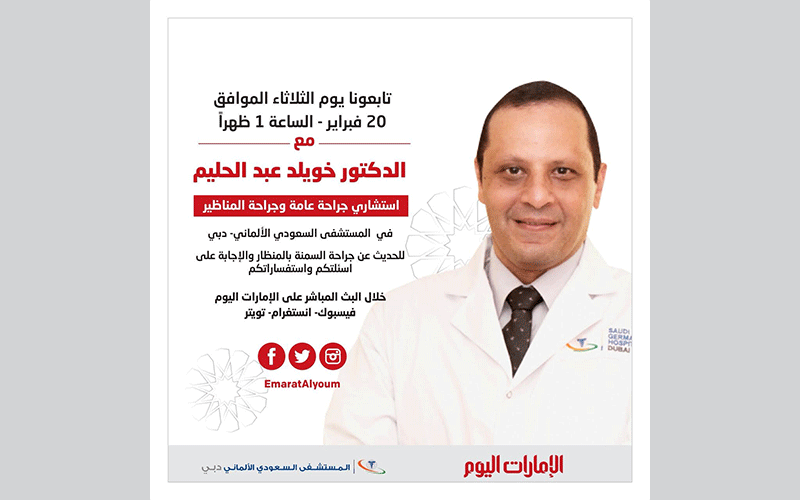 تابعونا، اليوم في تمام الساعة الواحدة ظهرا، في بث مباشر مع استشاري الجراحة العامة وجراحة المناظير الدكتور خويلد عبدالحليم، في المستشفى السعودي الألماني - دبي للحديث والإجابة على اسئلتكم واستفساراتكم عن جراحة السمنة بالمنظار.