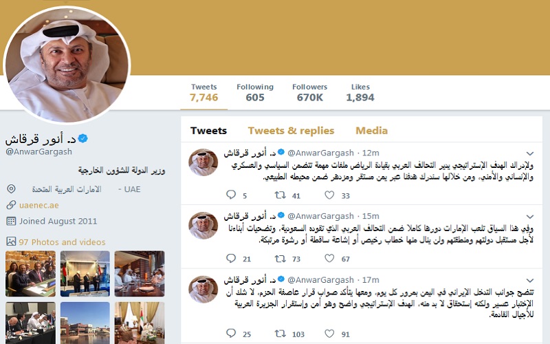 وأضاف قرقاش في تغريدات له على حسابه الرسمي في "تويتر": "وفِي هذا السياق تلعب الإمارات دورها كاملا ضمن التحالف العربي الذي تقوده السعودية، وتضحيات أبنائنا لأجل مستقبل دولتهم ومنطقتهم ولن ينال منها خطاب رخيص أو إشاعة ساقطة أو رشوة مرتبكة".