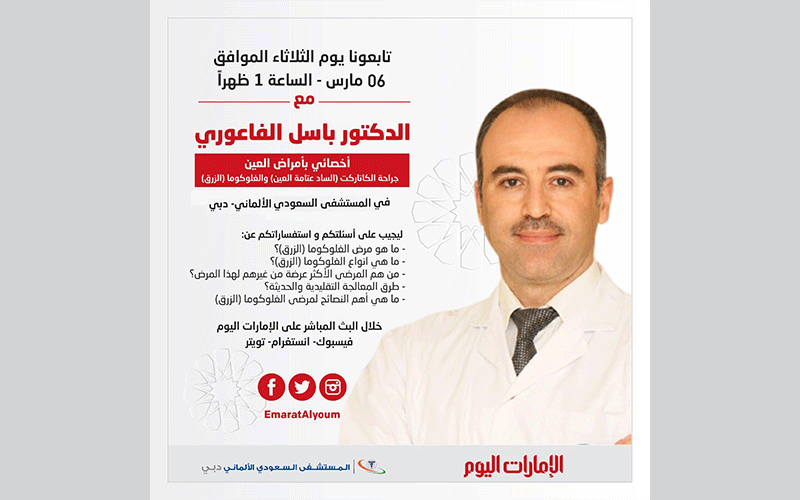 تابعونا، الآن الساعة الواحدة ظهرا، ببث مباشر مع الدكتور باسل الفاعوري، المختص بأمراض العين - جراحة الكاتاركت (الساد عتامة العين) والغلوكوما (الزرق)، في المستشفى السعودي الألماني - دبي للحديث والإجابة على اسئلتكم واستفساراتكم.