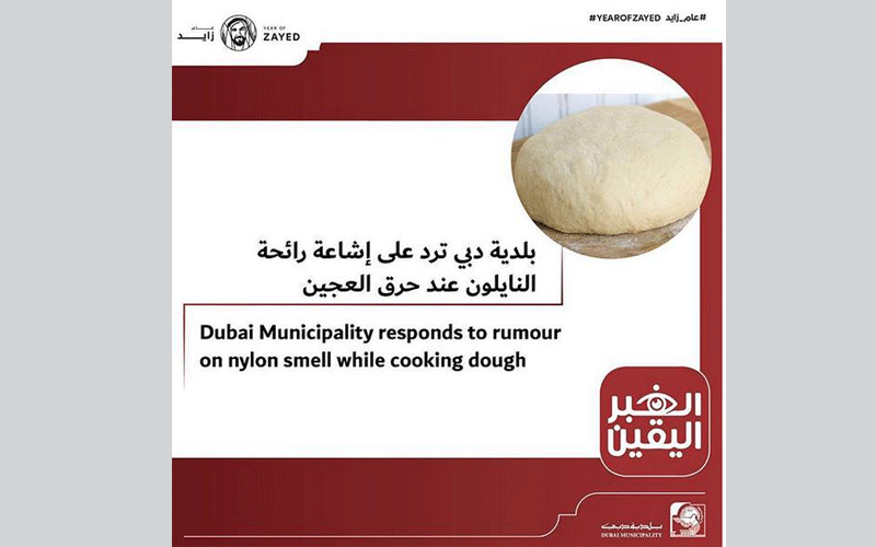رداً على ما تناولته وسائل التواصل الاجتماعي بشأن حرق العجين وخروج رائحة النايلون منه قالت بلدية دبي ان معظم المنتجات الغذائية تخرج منها رائحة غير مقبولة عند حرقها مع أنها ليست نايلون.