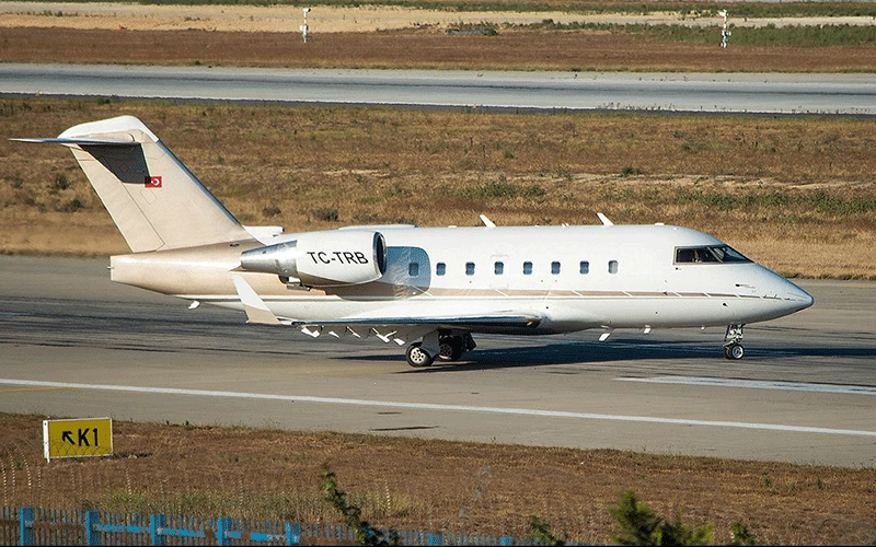 والطائرة من طراز "بومباردييه تشالنجر 600" مسجلة تحت الرمز "TC-TRB" وتستطيع استيعاب نحو 12 راكباً.
